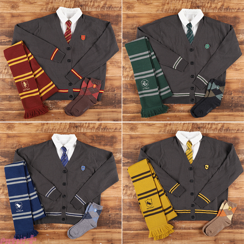 いずれもホグワーツ生をイメージした各4種のカラーで、カーディガンには各寮の象徴動物デザインの刺しゅうブローチが付属し、ソックスやマフラーにも各寮のエンブレムや象徴動物の刺しゅうがあしらわれています。