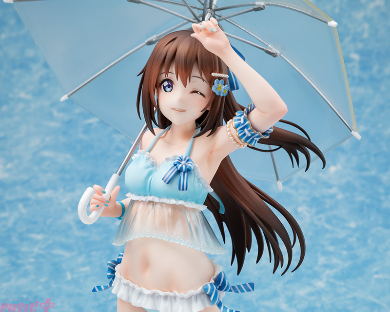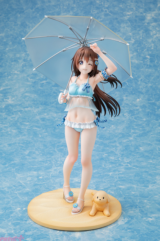 可愛らしい水着に身を包み、ビニール傘を手に浜辺を歩いているワンシーンを丁寧な造形と繊細な塗装で表現。スラリと伸びる足のラインはもちろん、彼女の周りに流れる潮風も感じ取れるような、フワリと流れる髪やリボンなどもこだわって再現しています。