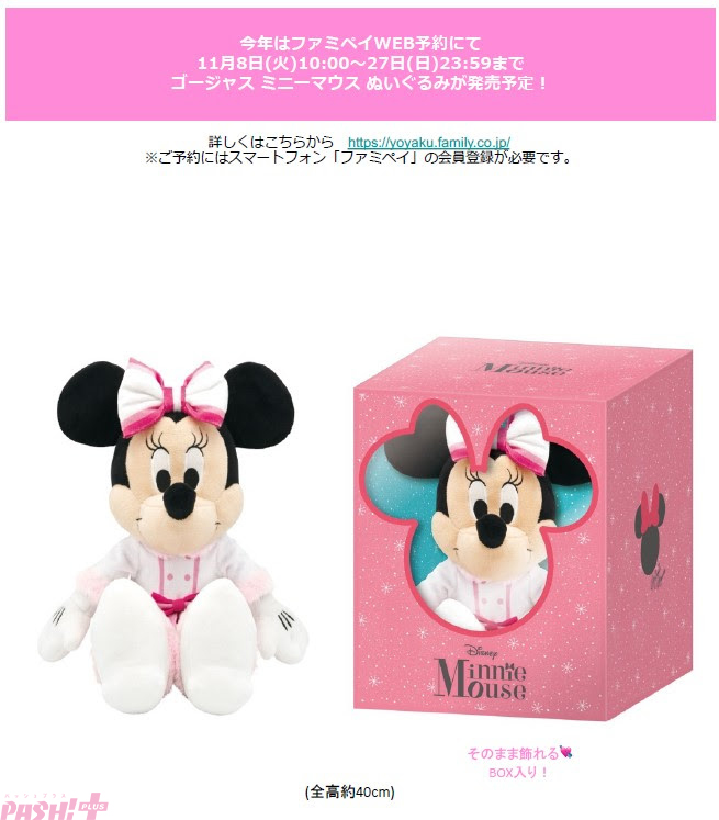 その他、今年はファミペイWEB予約にて11月8日10:00~27日23:59の期間、ゴージャス ミニーマウス ぬいぐるみが発売予定です。