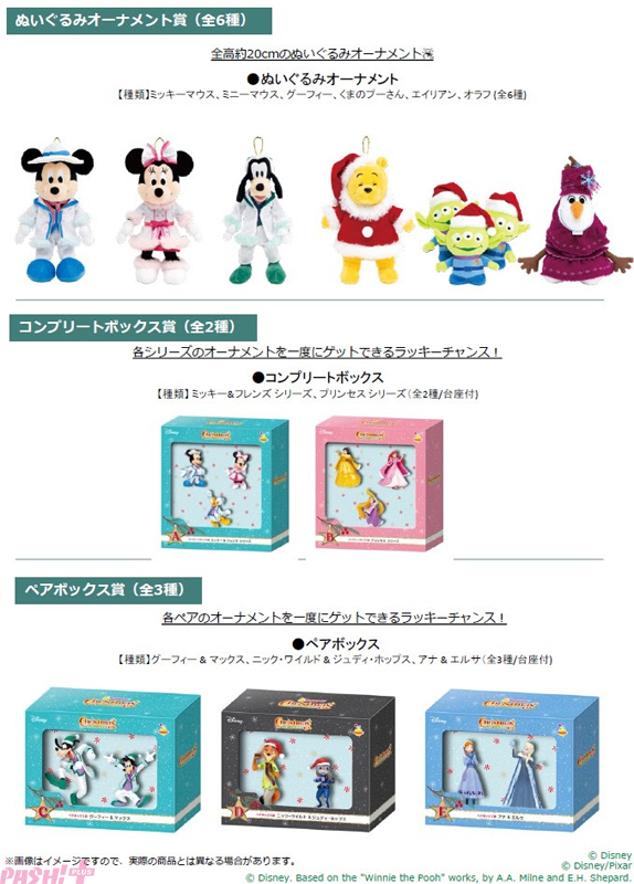 全12種類のオーナメントフィギュアや、各キャラクターシリーズが一度に揃うコンプリートボックス、ペアボックスをはじめ、今年はぬいぐるみオーナメントとアクリルオーナメントを新しくラインナップ。そしてラスト賞にはミッキーマウスのゴージャススタンディングぬいぐるみ(全高約60cm)をご用意いたしました!