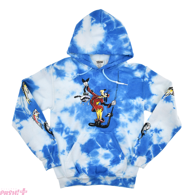 長袖パーカーは、短編映画『グーフィーの釣り教室』をモチーフにしたデザインで、タイダイ染めパーカーに描かれたレトロチックなアートもポイントになっています。両袖の魚のイラストにもご注目ください♪