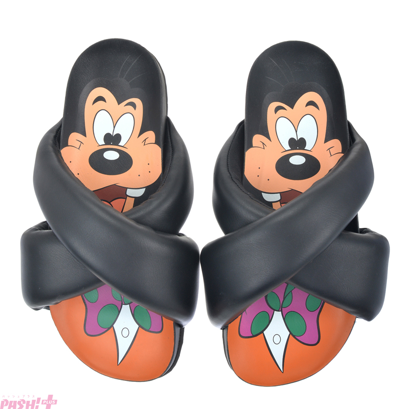 グーフィーデザインのファッショナブルなサンダルは、インソール一面にイラストが描かれ、グーフィーの耳が足に巻き付くようなデザインで、足を入れた時につま先からちょっぴり見えるオレンジ色がポイントです。靴下とのコーディネートを楽しむなど、あなたらしいディズニーファッションをお楽しみください。