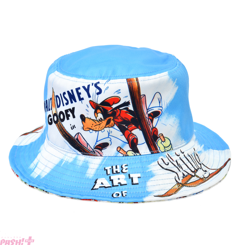 バケットハットは、半袖シャツにもデザインされているスキーを楽しむグーフィーのイラストと、カラフルでレトロチックなキャラクターイラストを楽しめるリバーシブル仕様です。