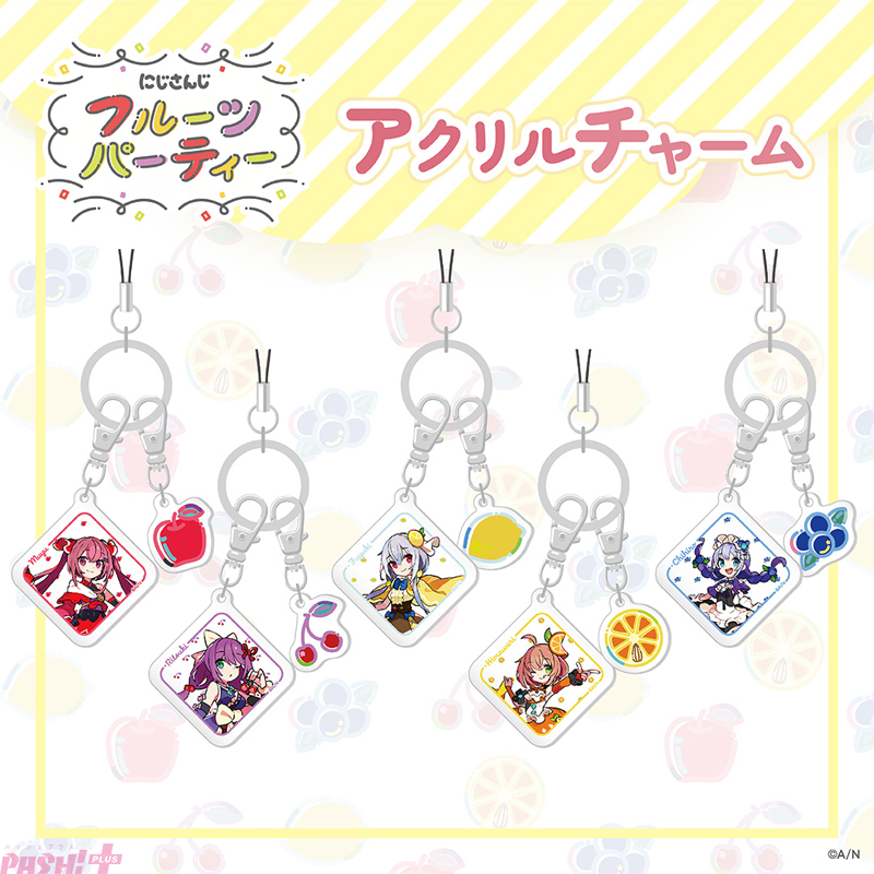 グッズラインナップは、アクリルスタンド、ランダム缶バッジ、アクリルチャーム、スマホループリボンの4種類。かわいらしいビジュアルで展開される“にじさんじ フルーツパーティグッズ”は、にじさんじオフィシャルストアにて2022年11月22日17:00から販売開始となります。