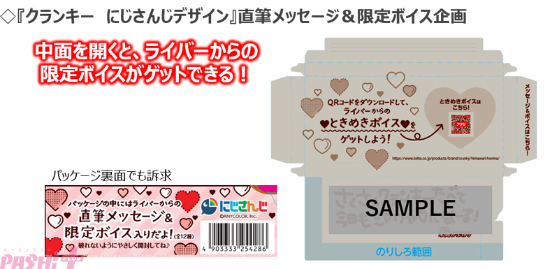 クランキーで初となるVTuberとのコラボとなる本商品では、12人のライバーがそれぞれのパッケージに登場するほか、『クランキー にじさんじデザイン』では、中面を開くとライバーの直筆メッセージが現れたり、QRコードから限定ボイスをゲットできたりします。