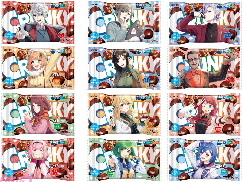 大人気VTuberグループ<にじさんじ>がクランキーと初めてのコラボレーション! 葛葉(くずは)や叶(かなえ)など、12人の人気ライバーたちが、パッケージに登場します。