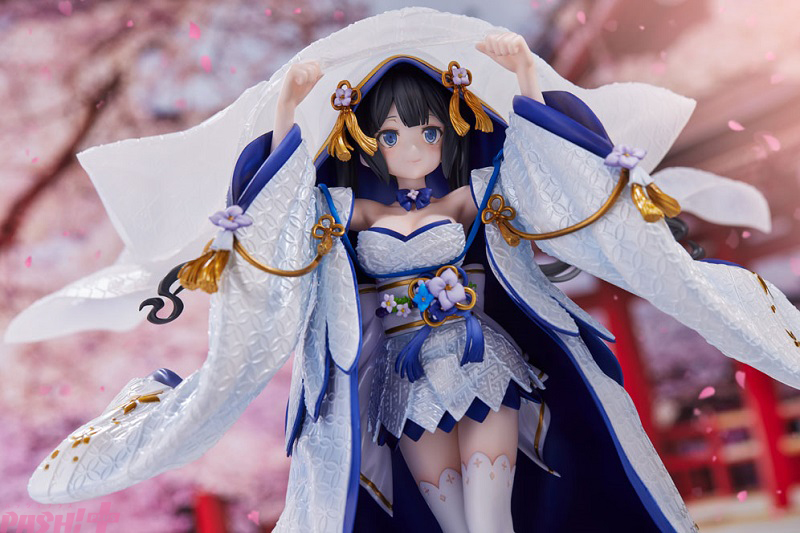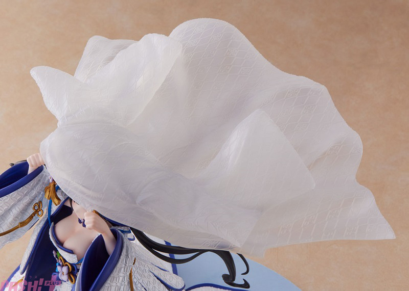 キャラクターカラーであるブルーの差し色が映える白無垢は、生地表面の繊細な模様を造形で丁寧に表現。表面にはパール塗装を施し、見る角度によってきらきらと美しく輝きます。