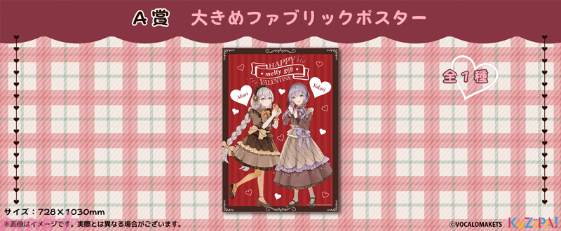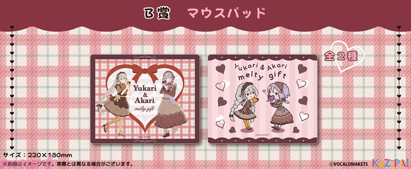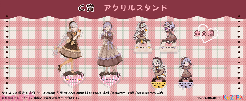 商品は、ファブリックポスター、マウスパッド、アクリルスタンド、クリーナークロス、ハート型缶バッジ、さらにくじを1点購入毎にチャレンジできる“+On Challenge”の景品のマグカップ(melty、chocolate、sweets)もご用意しています。ふりふりメイド服に身を包んだ、結月ゆかり・紲星あかりのクジパ限定描き下ろしグッズを是非ゲットしてください!