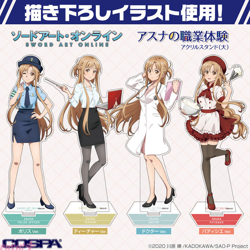 『ソードアート・オンライン』より、“アスナの職業体験”をテーマとした描き下ろしアクリルスタンドがCOSPA(コスパ)から新登場。ポリス、ティーチャー、ドクター、パティシエと様々な職業に挑戦するアスナを応援しましょう。