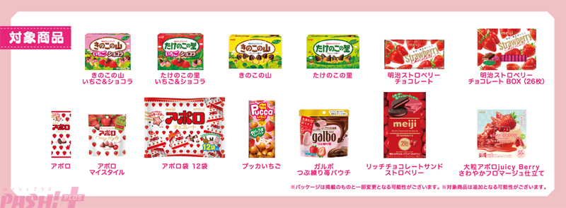 対象商品:『きのこの山いちご&ショコラ』、『たけのこの里いちご&ショコラ』、『きのこの山』、『たけのこの里』、『アポロ』、『アポロ袋 12袋』、『アポロ マイスタイル』、『明治ストロベリーチョコレート』、『明治ストロベリーチョコレート BOX(26枚)』、『プッカいちご』、『ガルボつぶ練り苺パウチ』、『リッチチョコレートサンド ストロベリー』、『大粒アポロジューシーベリーさわやかフロマージュ仕立て』