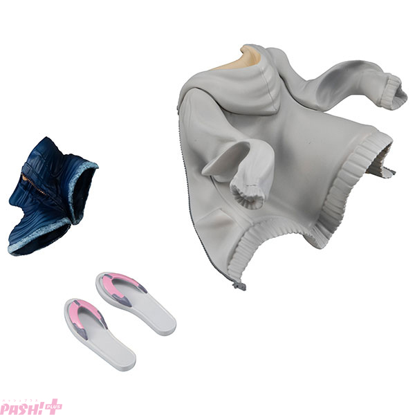 付属のパーカー、デニムハーフパンツは、取り外しが可能で好みで楽しめる他、世界観づくりに役立つ海をイメージしたクリアブルーの台座に小物としてビーチサンダルも付属します。