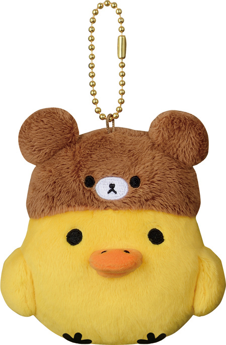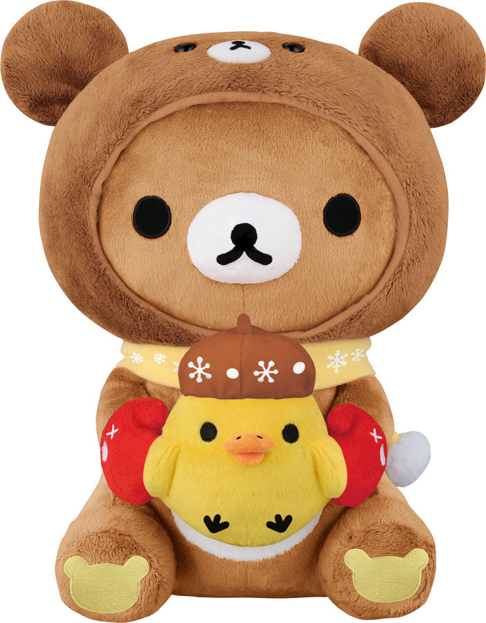 「チャイロイコグマ」のマネをしている「リラックマ」の ぬいぐるみです。「キイロイトリ」を抱っこしています。