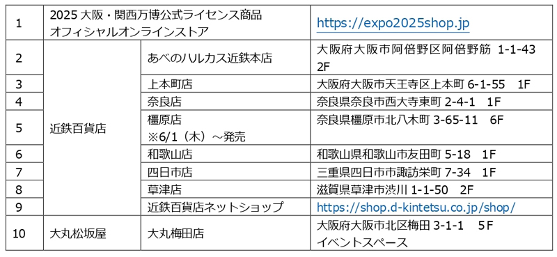 2023年5月31日10:00より“2025大阪・関西万博公式ライセンス商品オフィシャルオンラインストア”および近鉄百貨店取扱各店舗、大丸梅田店にて販売されます。