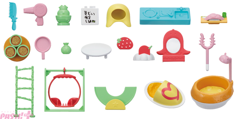 本アイテムには、ドールハウス遊びを盛り上げるアイテムが21種類付属します。討伐対象の虫、報酬の入った袋、大きなスライスチーズ、パイシチューのお風呂など、作中でのサイズ感や、やさしくやわらかい表現にこだわったないようです。