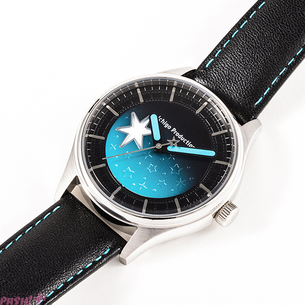 アクアの瞳の輝きを表現した腕時計。アクアブルーのグラデーションを基調に星を散りばめ、外周には映画のフィルムを型押しであしらいました。
