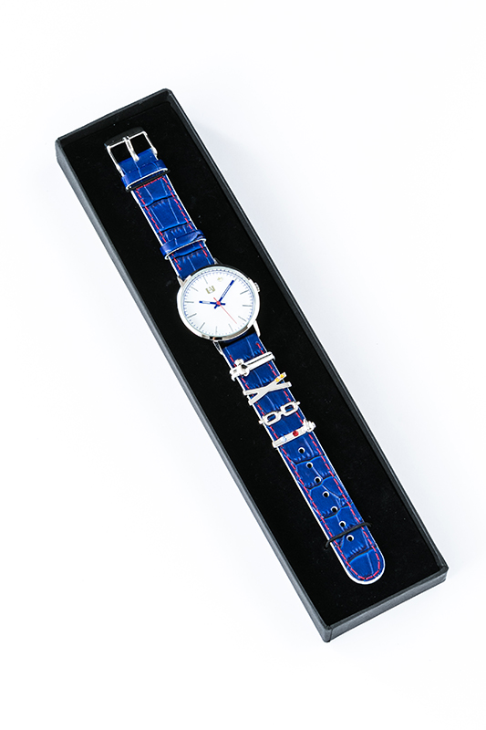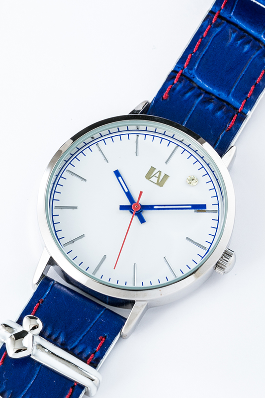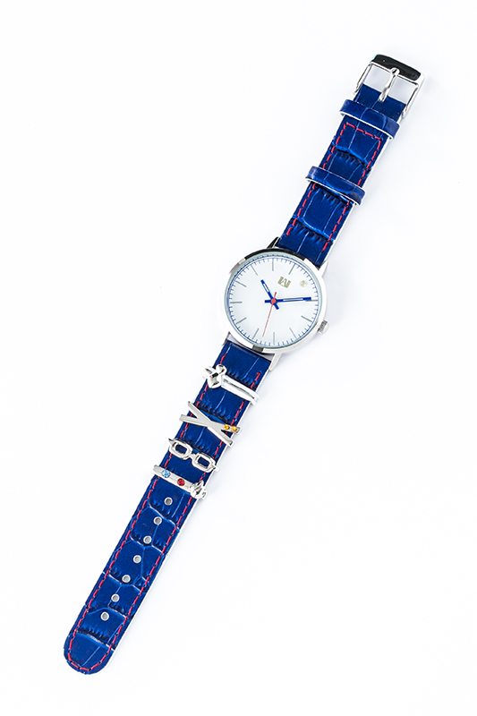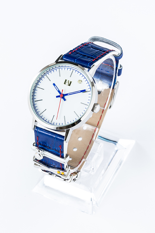 腕時計の牛革のベルトは青を基調とし、赤のステッチがアクセントになってかわいく、文字盤はシンプルなデザイン。また、ベルトに取り付けられる緑谷出久・爆豪勝己・飯田天哉・轟 焦凍をモチーフにしたチャームが付属する。気分によって組み合わせを変えてもオシャレ♡