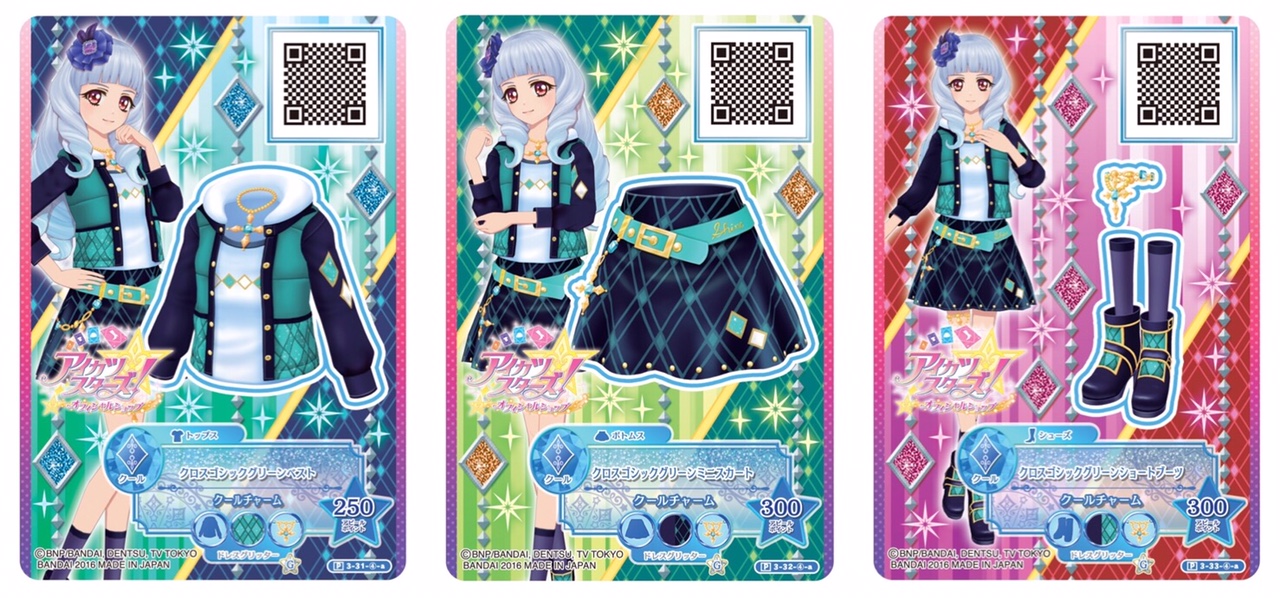 また、2,000円購入ごとに、白銀リリィのクロスゴシックグリーンコーデ3種、二階堂ゆずのビーズカラフルドットコーデ3種の、合計6種の『ショップ限定アイカツ!カード』のなかから1枚カードのプレゼントも。リリィのアイドル活動を一緒に応援しよう♪