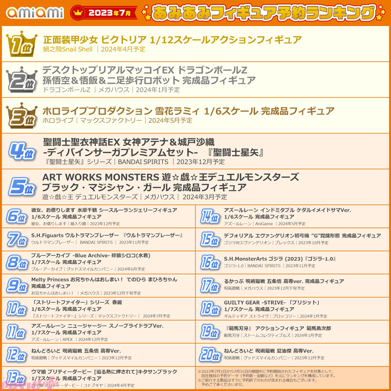 ※2023年7月1日~7月31日の期間中に予約開始されたフィギュアを対象として、独自の予約データ(予約数・金額など)を元にランキングを構成。