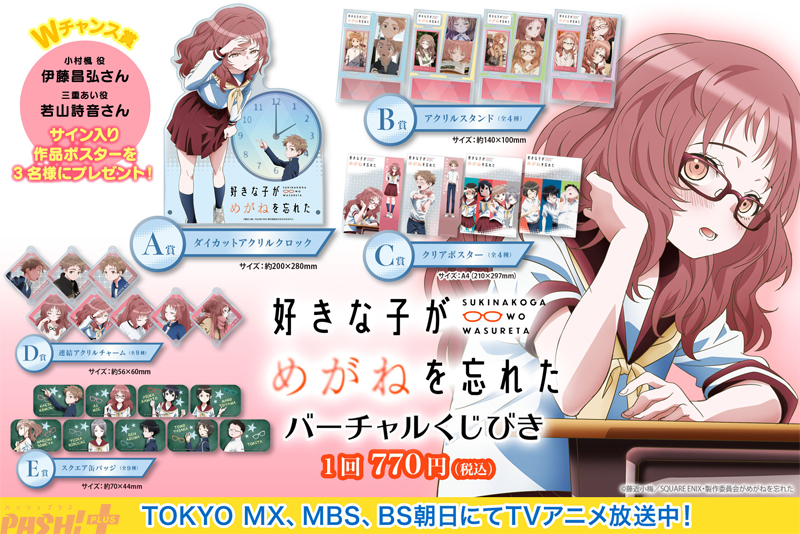 スカイラボが運営するオンラインくじびきサイト“バーチャルくじびき”にて、『TVアニメ「好きな子がめがねを忘れた」バーチャルくじびき』が販売中です。