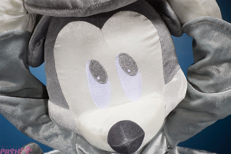 100周年のメモリアルとして、ぬいぐるみの足の裏には“ディズニー100”の公式ロゴを刺繍。帽子や服には光沢のあるクラッシュベロアという素材を使用し、腰のベルトにもこだわり質感の出る素材をセレクトしています。本商品の特長でもある目の部分にはラメの入った銀色の糸で刺繍を施し、ミッキーのキラキラと輝く瞳を表現しています。