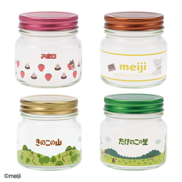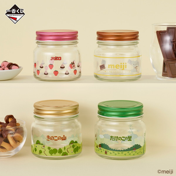 C賞は、<アポロ>デザインと、<きのこの山/たけのこの里>デザインのポーチをラインナップ。パステルカラーの普段使いしやすい色合いに加え、中には仕切りもついていて実用性もばっちりです。D賞は、お菓子やジャムなどの食品にも使用できるガラスキャニスター。フタの色がそれぞれ異なり、どれを選んでも楽しいアイテム。