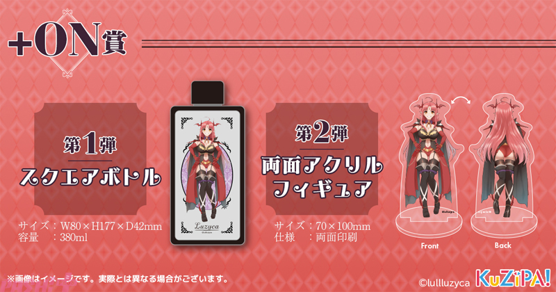 くじを引くごとに自動抽選にて豪華景品ゲットのチャンスがある「+ON賞」では、スクエアボトルと両面アクリルフィギュアがそれぞれ10名の方に当たります。いつもよりちょっとだけ悪くてちょっとだけ強い女幹部「ルル=ルチカ」の限定グッズです。