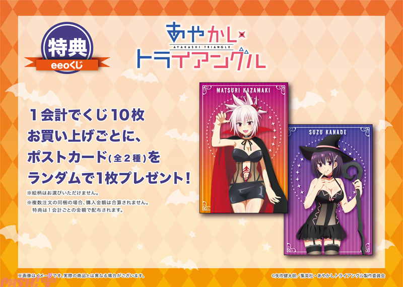 TVアニメ『あやかしトライアングル』の「eeoくじ」を1会計で10枚ご購入ごとに、ポストカード(全2種)をランダムで1枚プレゼント。「eeoくじ」を購入した記念として、ポストカードもぜひゲットしてみてください。
