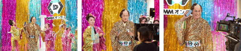 今回の新CMは、「DMMオンクレ」の景品となったマツケンさんがショーケースの中でバックダンサーの腰元ダンサーズとともに「マツケンサンバII」を披露、そして「DMMオンクレ」バージョンの「マツケンサンバII」を歌いながら「DMMオンクレ」の紹介をしていると、クレーンに掴まれ持ち上げられるものの落ちてしまうというストーリーになっています。CMの最後となるマツケンさんがクレーンから落ちるシーンは、普段あまり見ることができない、マツケンさんが驚く表情が印象的なカットで締めくくられます。