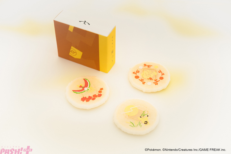 麩焼き煎餅でピカチュウ(オス/メス)・キュウコン・ホウオウと秋の京の風景や行事を表現しました。麩焼き煎餅とは、もち米から一枚一枚焼きあげた、優しい口どけが魅力の甘い煎餅です。絵は職人の手でていねいに描いています。