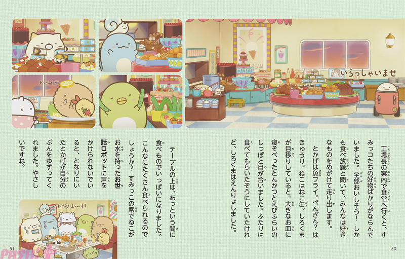 ▲制服姿がかわいいすみっコたちやおいしそうな食べ物がいっぱい並ぶ工場の食堂の様子なども見られます。