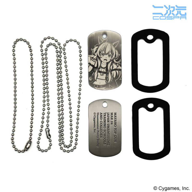 マヤノトップガンが身につけているドッグタグをイメージしたアイテムです。イラスト面は高精細レーザープリントで細部までしっかり表現しています。文字は凹凸のある刻印でリアリティのある落ち着いた加工です。