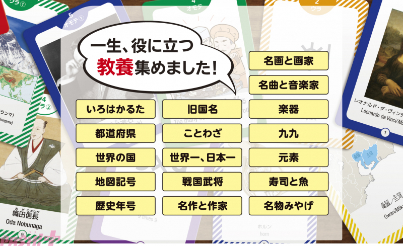 本商品は、いずれは学校で必ず覚えなければならないことから、大人になってからも何かと役に立つ一般教養的雑学までを、楽しみながら習得できる読み上げモジュール付きカルタゲーム。