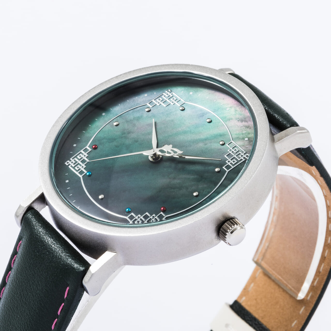 光の当たり方によってきらめくブラックシェルの盤面が、猫猫の瞳を連想させる腕時計。猫猫(マオマオ)の髪色のようなベルトに、毒見用の銀食器を思わせるケースをセレクトしています。