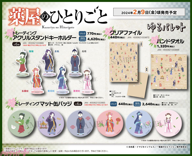 放送中のTVアニメ『薬屋のひとりごと』より、待望の描きおこしグッズが登場。「TOHO animation STORE」のオリジナルデフォルメキャラクター「たすっこ」シリーズと、キャラクターをゆる~く描いたイラストが特徴の「ゆるパレット」シリーズ、2シリーズでの発売が決定しました。