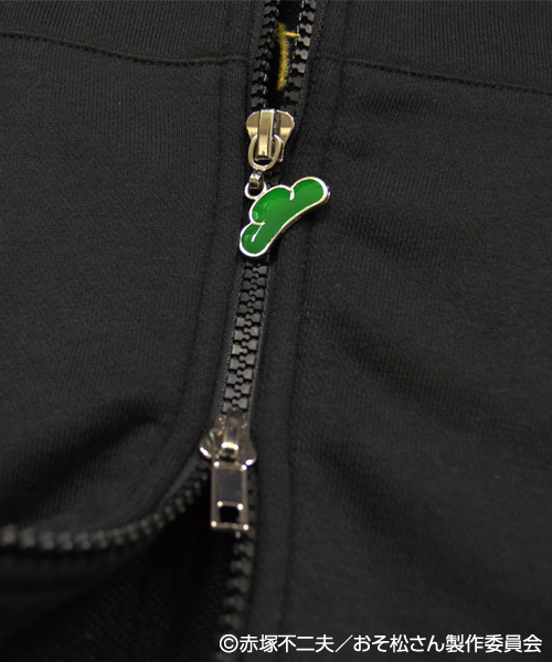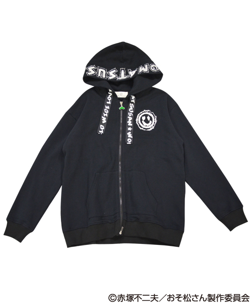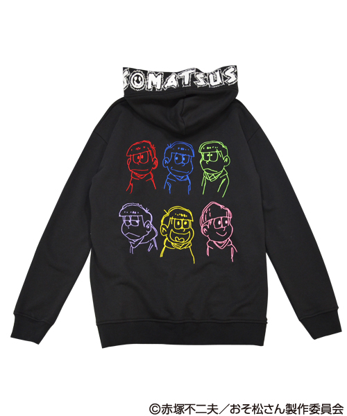 パーカーは胸元にWORLD WIDE LOVE!ではお馴染みのデッドスマイル、バックにそれぞれのイメージカラーで刺繍された6つ子が大集合のにぎやかなデザインとなっている。また、ファスナーには松マークのついたチャームがついているこだわりの商品だ。サイズはゆったり着られるオーバーサイズで2サイズが用意される。