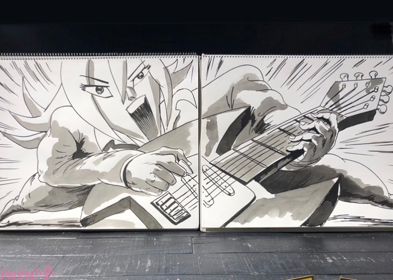 あぽろんは、クリエイティブチーム・AC部の「高速紙芝居」に登場するヘルシェイク矢野が持つアニメのギターを実機として開発。現実世界で実際に演奏できるギター「ヘルシェイク矢野モデル」をリリースしました。