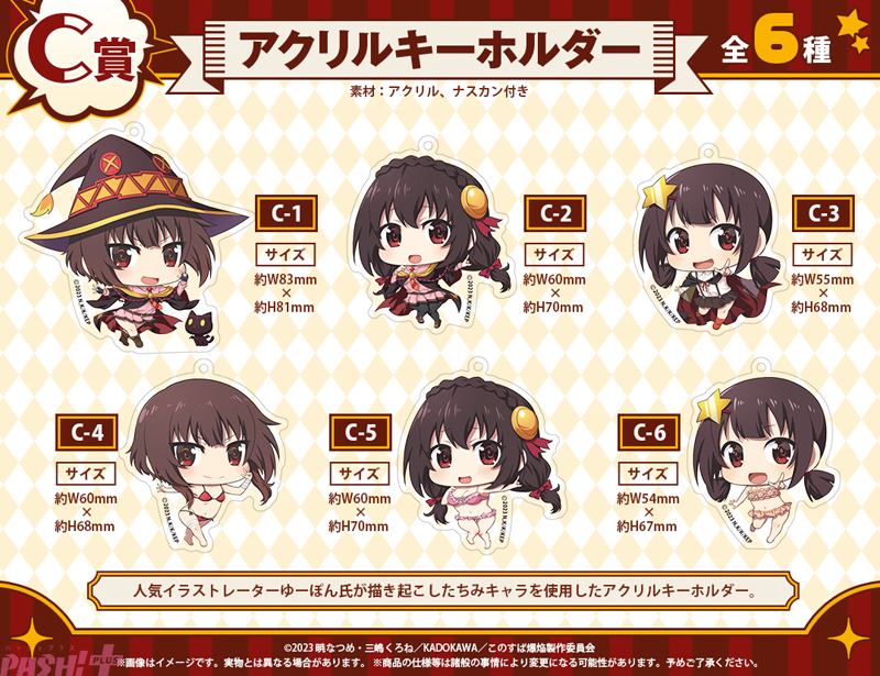 新規描き下ろしとなる水着姿のイラストを使用しためぐみん・ゆんゆんのロングタペストリーやゆーぽん氏描き起こしのちみキャラアクリルキーホルダーなど全24種類のグッズをラインナップ。さらに、「どこプラ」公式Xアカウントではくじ販売開始にあわせて、缶バッジ全種セットが当たるリポストキャンペーンも実施しています。