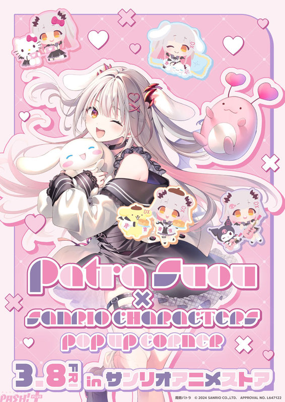 「周防パトラ×サンリオキャラクターズ」のPOP UPコーナーが、2024年3月8日からサンリオアニメストア池袋P’PARCO店で開催決定。開催に先がけ、新作グッズの先行販売が1月23日よりサンリオアニメストアONLINE(通販)にてスタートします。
