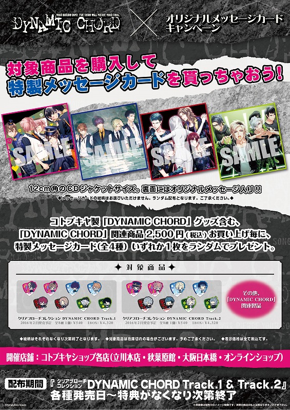 2017年2月にコトブキヤから、バンドをテーマにしたシリーズ『DYNAMIC CHORD』のバンドマンたちをプリントしたクリアブローチの第1弾と第2弾が発売される。