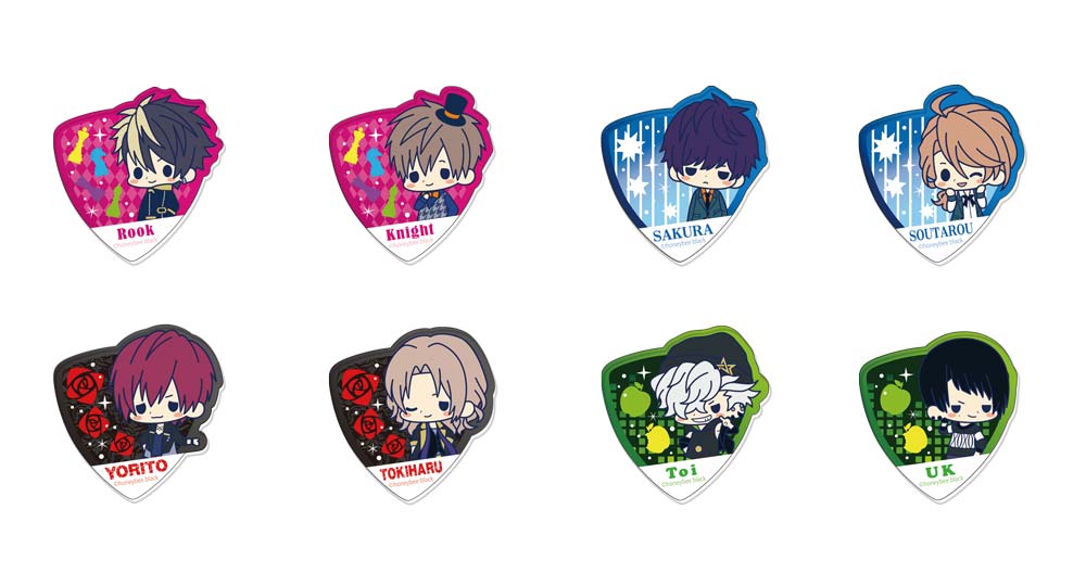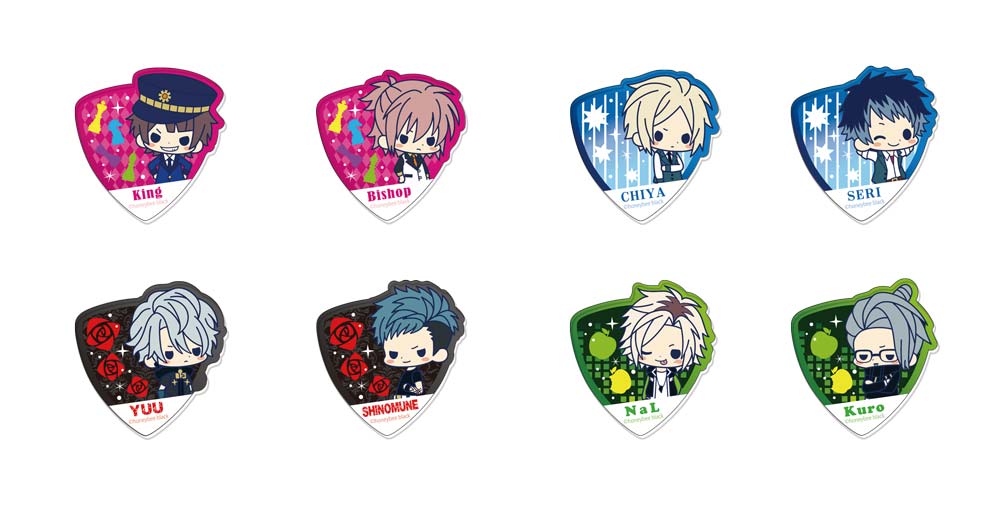 第1弾はRook、Knight、檜山朔良、榛名宗太郎、YORITO、TOKIHARU、Toi、UKの全8種、第2弾はKing、Bishop、珠洲乃千哉、結崎 芹、YUU、SHINOMUNE、NaL、Kuroの全8種のラインナップとなっている。