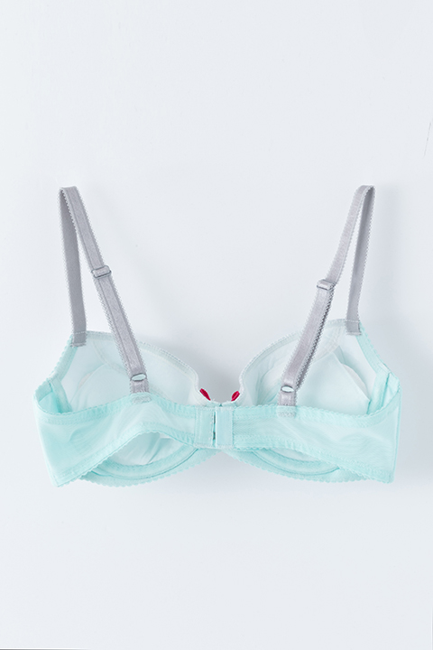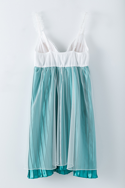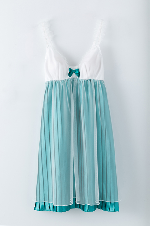 ランジェリーセット、キャミソールのどちらも爽やかな“ミクブルー”を基調とし、白いレースが清楚でかわいらしいデザインで、ランジェリーセットはピンクのリボンが、キャミソールはグリーンのリボンがワンポイントになっている。