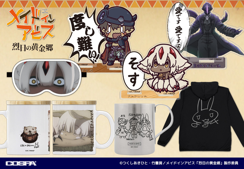 COSPAより、TVアニメ『メイドインアビス 烈日の黄金郷』の新作グッズとしてアクリルスタンド・マグカップ・アイマスク・パーカーが新発売。2024年6月の発売を予定しており、コスパオフィシャルショップ・コスパWEB通販で予約受付中です。