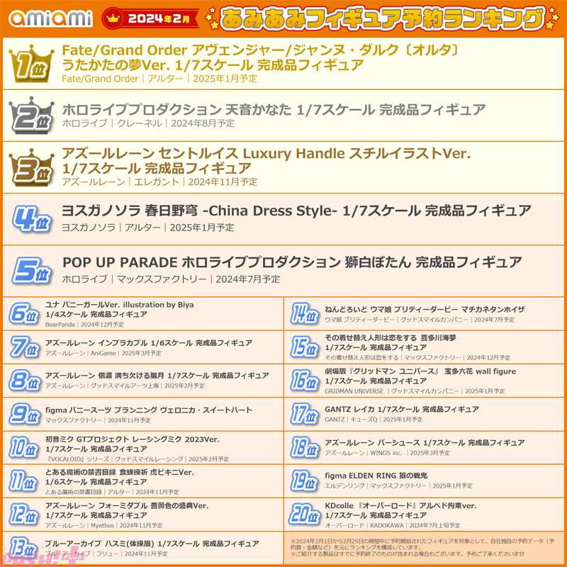 2024年2月あみあみフィギュア月間ランキング 20位まで一覧