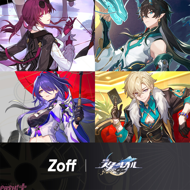 コラボキャラクターはカフカ、丹恒・飲月、黄泉、アベンチュリンの4名。全4種類で、限定デザインのメガネ拭き&ケースが付属します。また、全国のZoff5店舗での試着コーナーの設置や、オリジナルカプセルトイの発売も実施します。