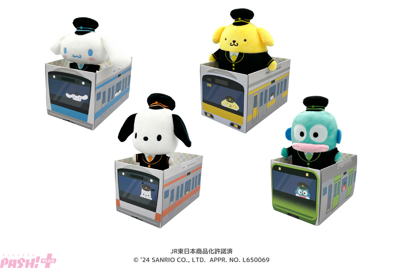 車両モチーフのボックス付きぬいぐるみ。シナモロール、ポムポムプリン、ポチャッコ、ハンギョドンの4キャラクターが車掌さん風でとっても可愛い。ボックスの上にぬいぐるみを乗せて、電車ごっこ風に遊ぶことができます。