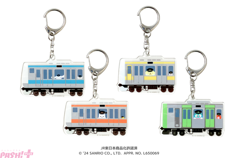 車両がモチーフのアクリルキーホルダー。通勤電車に、シナモロール、ポムポムプリン、ポチャッコ、ハンギョドンが車掌さんとして窓から顔を出しています。後部の窓には隠れキャラクターもいるのがポイント。
