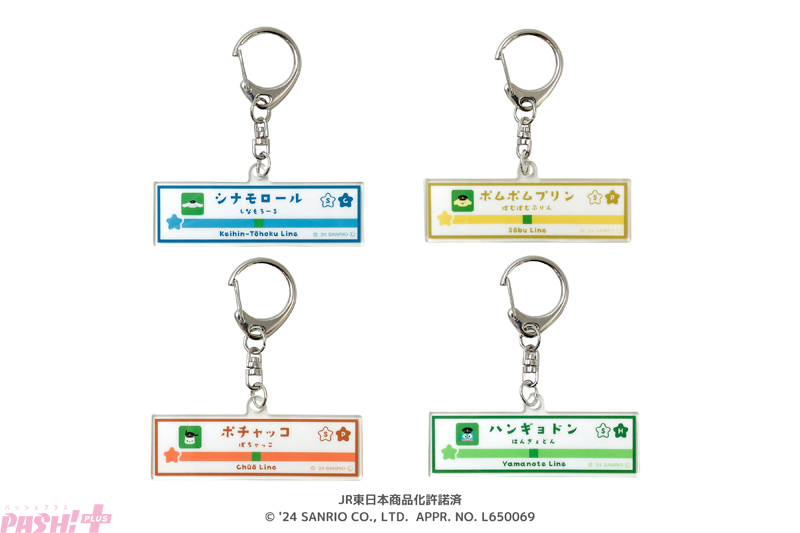 駅名標をモチーフとしたアクリルキーホルダー。シナモロール、ポムポムプリン、ポチャッコ、ハンギョドンのキャラクター名と、実在する線路名がローマ字で記載されているのがポイント。好きなキャラクターやコレクションにGETしたいアイテム。