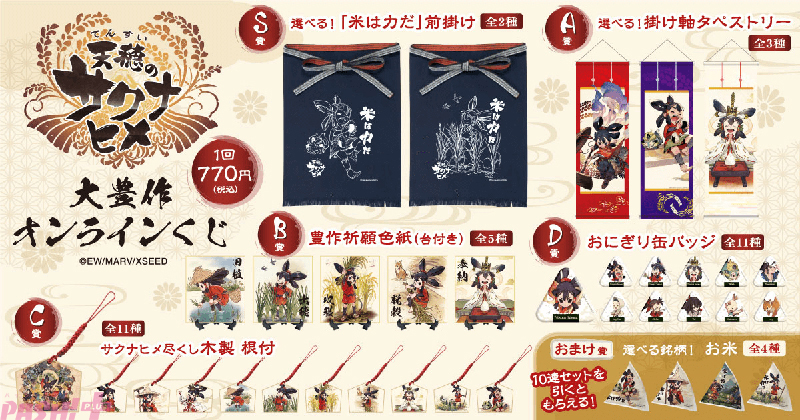 賞品は、『天穂のサクナヒメ』の本くじオリジナルグッズとなります。『天穂のサクナヒメ』の魅力的なビジュアルを用いた賞品や、主人公サクナヒメの様々な表情を楽しめる賞品などを多数展開しています。