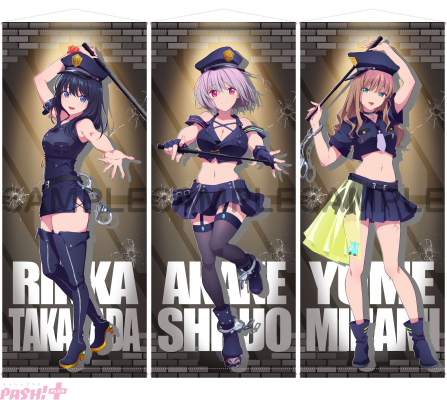 アメリカンポリスコスプレに身を包んだヒロインの3人がタペストリーになって登場。ほぼ等身大サイズのビッグスケールなので存在感はバツグン! お部屋に飾ればまるでヒロインがすぐ隣にいるような気分を味わえること間違いなし! イラストは公式描き下ろし仕様です。