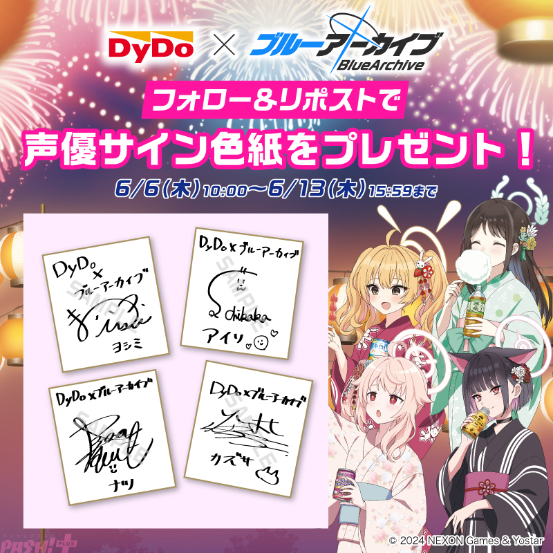DyDo×ブルーアーカイブ プレゼントキャンペーン(公式)Xをフォローして対象の投稿をリポストすると、放課後スイーツ部のカズサ役・夏吉ゆうこさん、アイリ役・杉村ちか子さん、ナツ役・長縄まりあさん、ヨシミ役・真野あゆみさんのサイン入り色紙を抽選でそれぞれ3名、計12名にプレゼント!